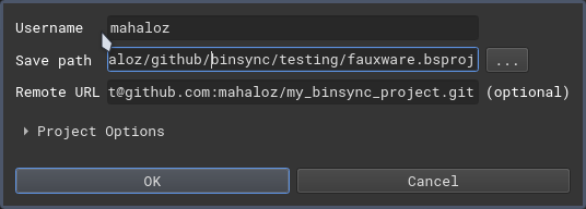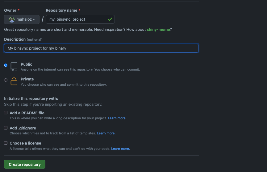 Like in the Joining a Project section, you can create your own repo for a BinSync project. BinSync will work with any Git URL, but for this tutorial, we will only show you how to do it on GitHub.