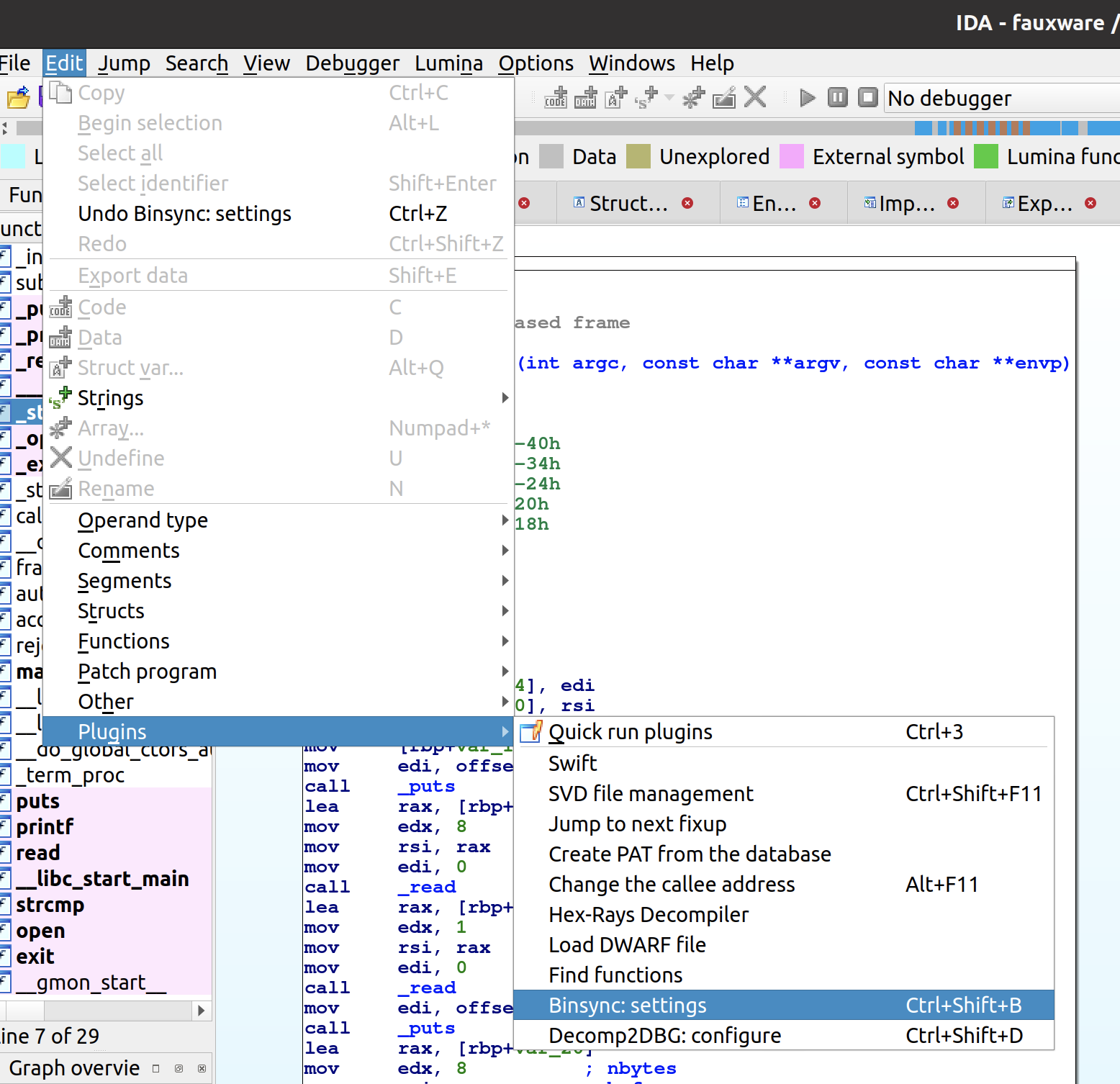 Open the fauxware binary in your decompiler. Make sure to save decompiler artifacts (.bnpr, .ida files, etc.) outside the BinSync repo. Verify BinSync has loaded in the decompiler's terminal or log window: